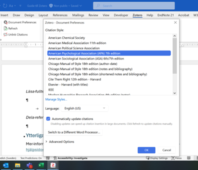 Första gången du gör detta i ett dokument ombeds du att välja referensstil samt språk. Vilket påverkar utformningen av dina referenser. Kan ändras senare via document preferences.